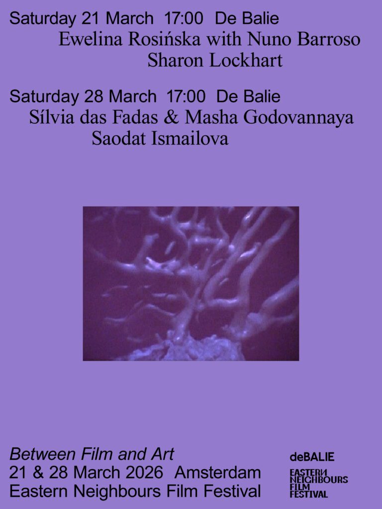 In collaboration with Eastern Neighbours Film Festival, De Balie presents Between Film and Art, the festival’s travelling programme for experimental cinema and artist-driven film. Across two Saturdays, we screen four acclaimed films from and in relation to broader Eastern Europe. Today: her* hands and his shape and Bibi Seshanbe, two films in which cinema becomes ritual – followed by a conversation with Sílvia das Fadas and Masha Godovannaya, moderated by the curator Temra Pavlović.
