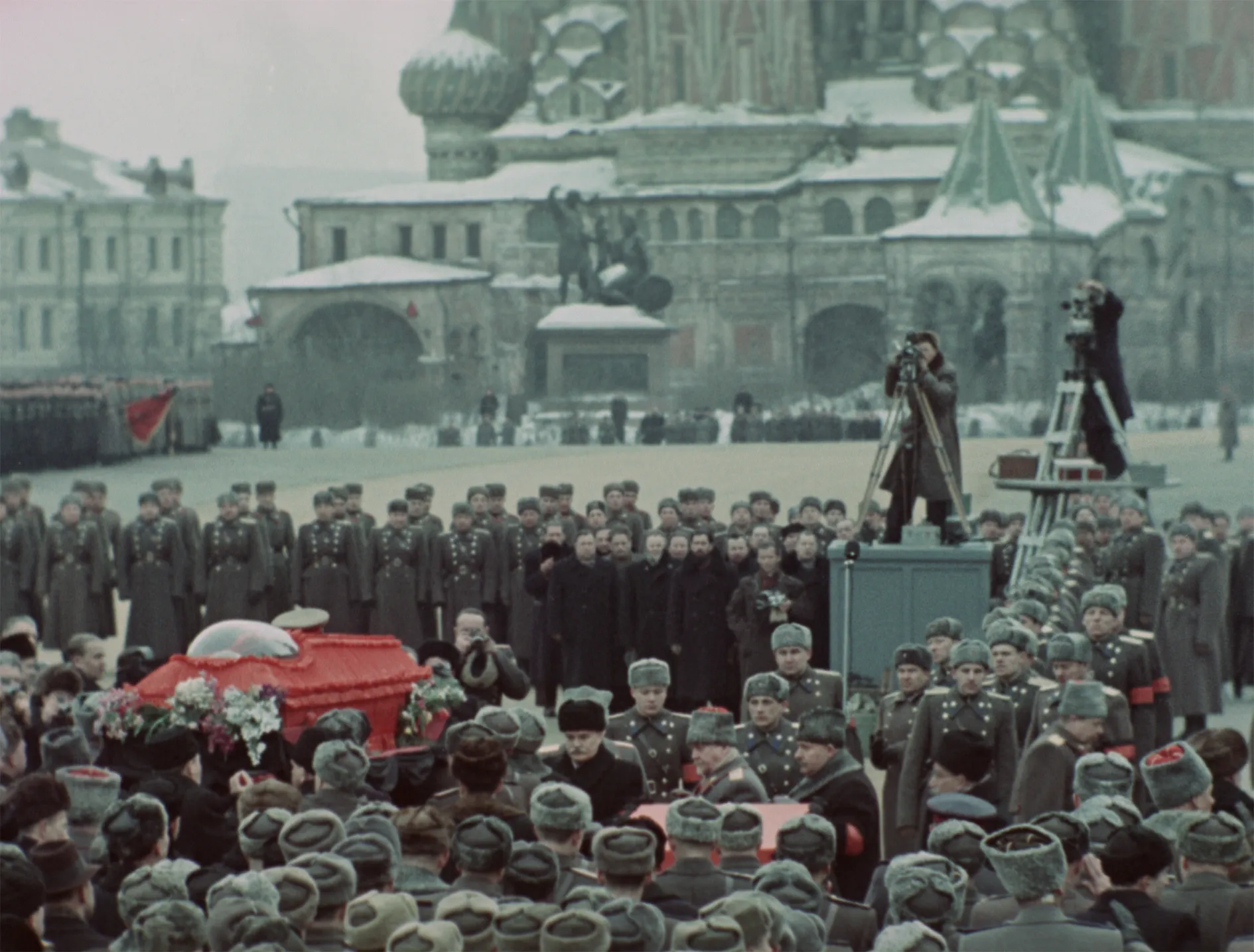 Een betoverende assemblage gemaakt van archiefbeelden bedoeld voor The Great Farewell, een nooit uitgebrachte speelfilm over de begrafenis van maart 1953 van de Sovjet-maximumleider Joseph Stalin.