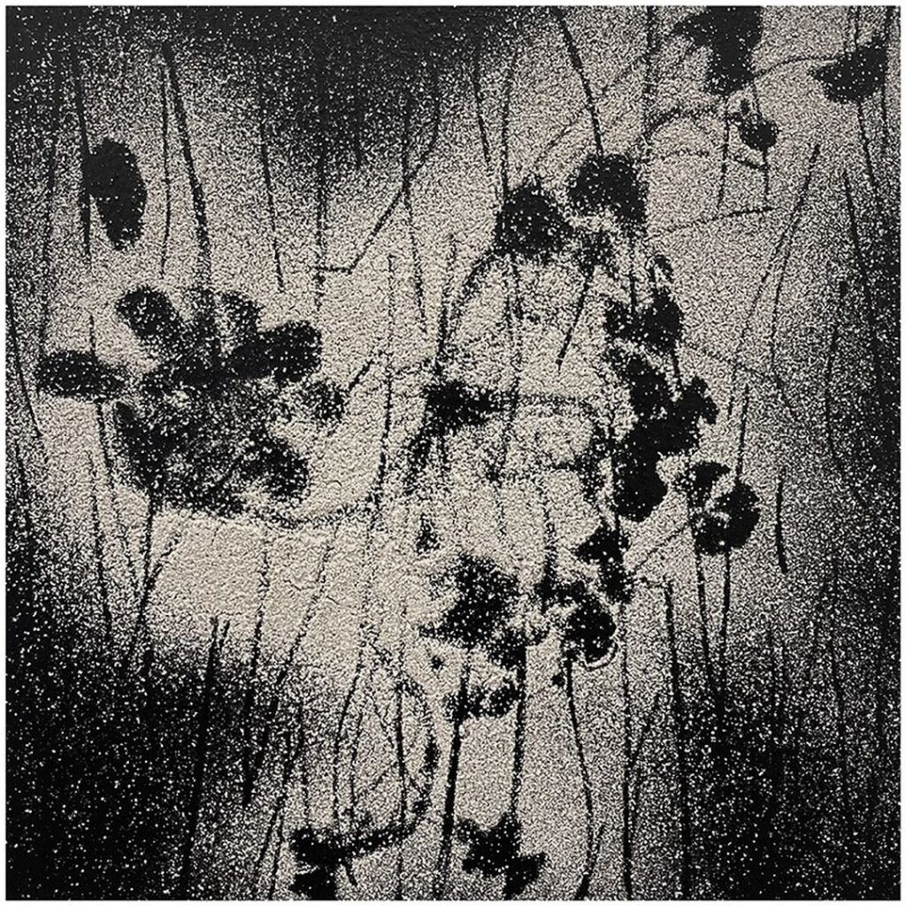 The factory discharges its soda ash into a stream created for this purpose that leads directly to the sea. This material ‘bleaches’ the beach, so much so that it can be seen on satellite photos. It also severely decreases the area’s biodiversity. Meanwhile, different heavy metals and other toxics that come out of the chimneys settle in the area, causing a higher risk of heart disease, neurological disorders and cancers among the local population. During several visits, TINKEBELL. dug the white soda ash directly from underneath the bottom of the trash river and collected vegetation from the Solvay site, such as pinecones and pine needles. Back in her Amsterdam studio, she used the factory’s trash to create prints of the plants on prepared black canvas, thus making artworks that are deceptively pretty – just like the beach at Rosignano Solvay.