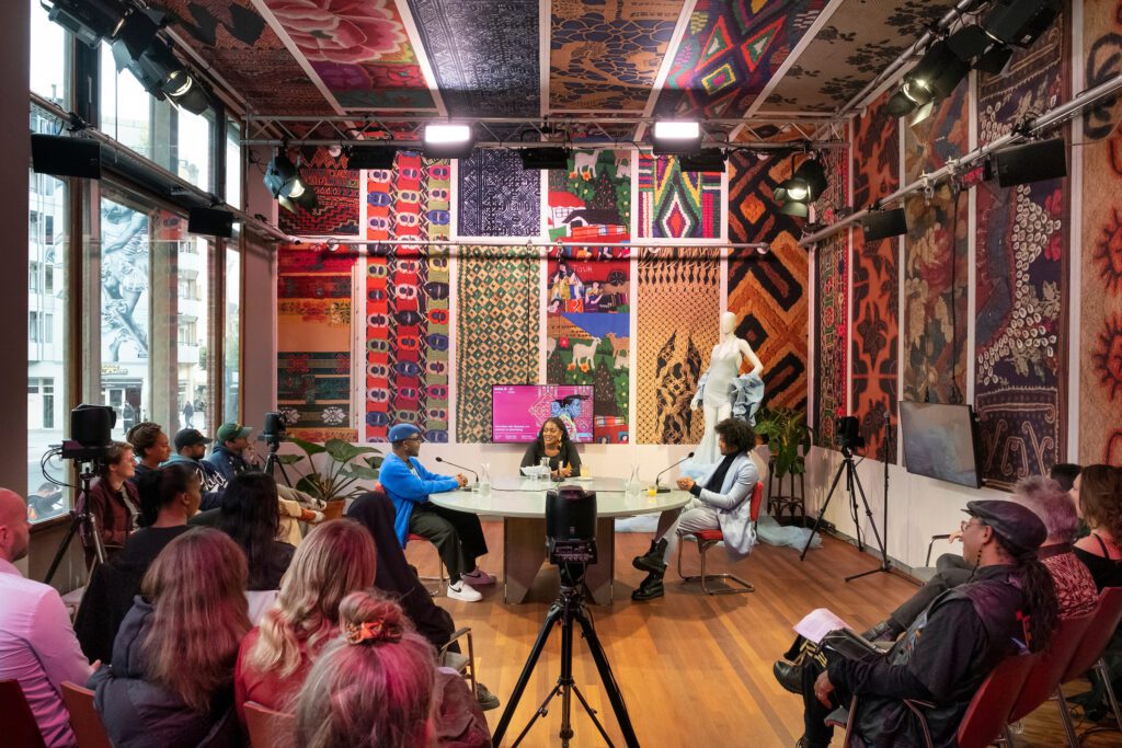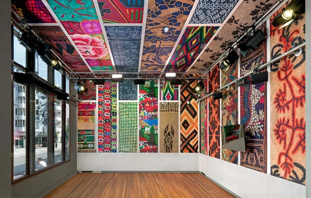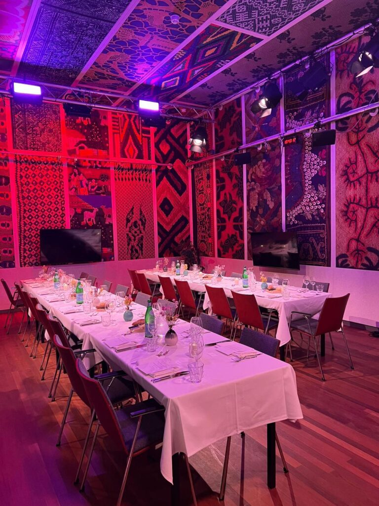 De Pleinzaal: een studio met uitzicht op het Kleine-Gartmanplantsoen, ontworpen door Rogier Weijand met fragmenten uit het werk ‘ My Second Skin’ van Barbara Broekman. Een mooie ruimte voor culinaire gelegenheden of hybride evenementen.